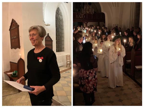 Ulla Schwartz med medalje - Lucia-gudstjeneste - Tillitze Kirke dec. 2022